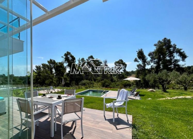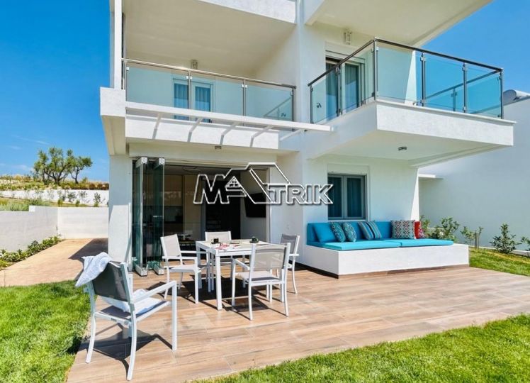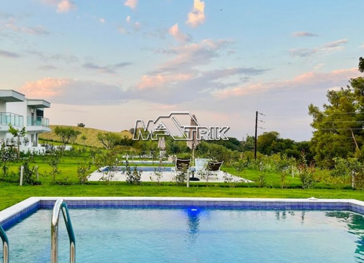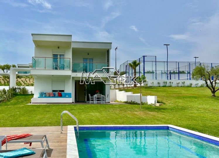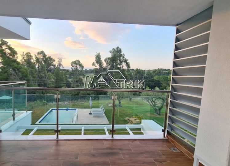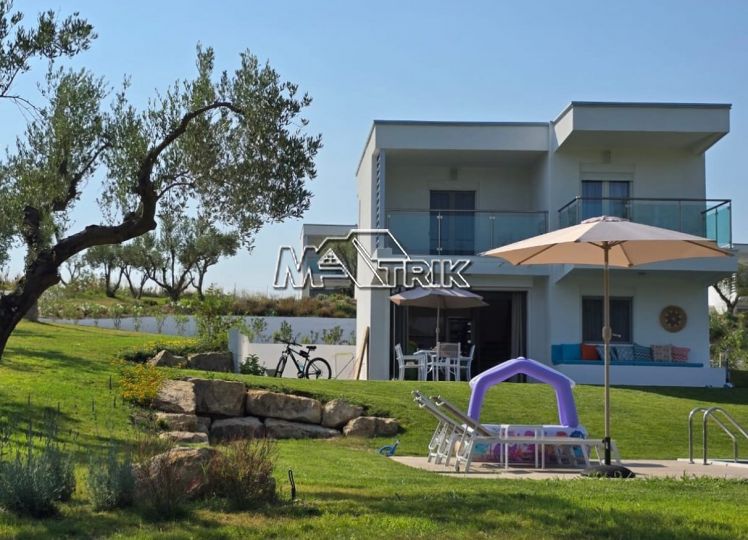 Sani, luxurious detached houses inside a fenced and guarded complex, with unobstructed views of the verdant slopes of the area. It is located 8km from the famous "Sani" hotel complex and 5km from "Simantro" beach. Each house is spread over two levels. On the ground floor there is a living room with kitchen and one bedroom with access to the yard and one bathroom. On the 1st floor there are two additional bedrooms with access to the balcony and the second bathroom. They have an external security door, double glazed aluminum window frames, quality tiled and laminate flooring, full kitchen furniture, closets, three air conditioners, solar water heater, infrastructure for alarm and satellite TV, three parking spaces, private outdoor swimming pool 4X6m and 350sqm to 1200sqm yard of exclusive use. There is Tenis courts for use in the complex. The complex is constructed with the most advanced construction materials and the latest building technologies, in order to achieve the maximum possible energy efficiency and smooth long-term operation of the house, without additional maintenance costs. The villas are a great choice as a holiday home with easy access from Thessaloniki and the airport. It is also offered as an investment property, with a very satisfactory return on capital. The prices of the detached houses range from 330000 euro up to 380000 euro, depending on the location and the size of their yard.