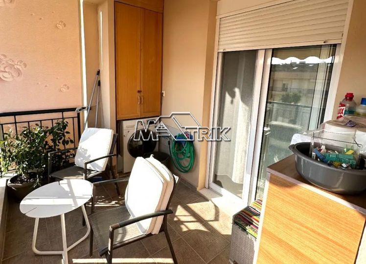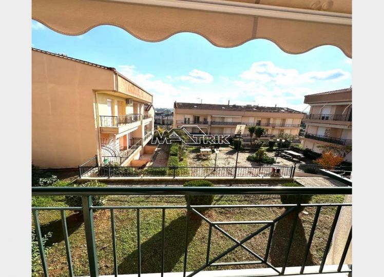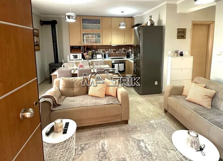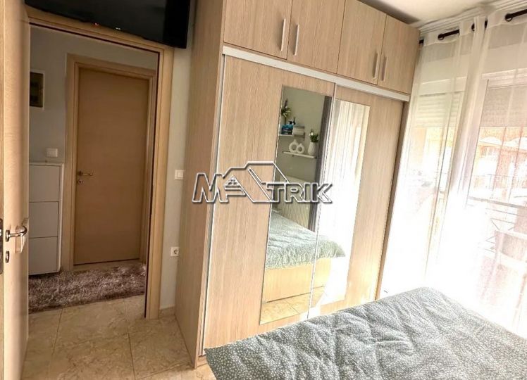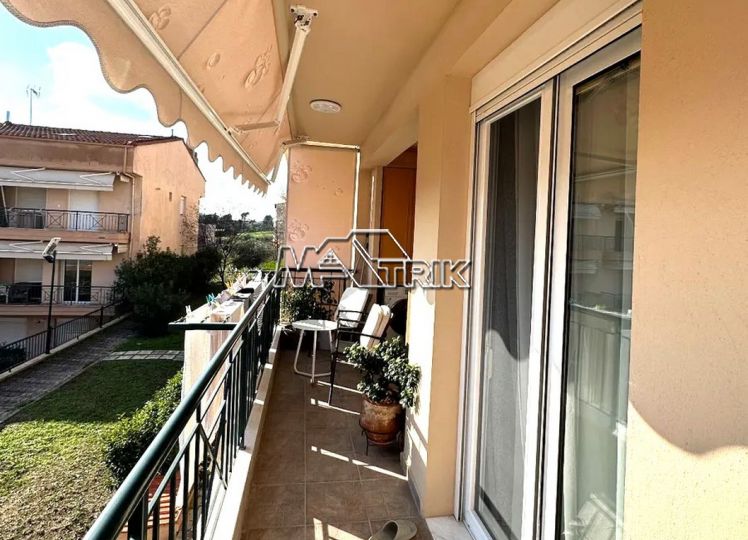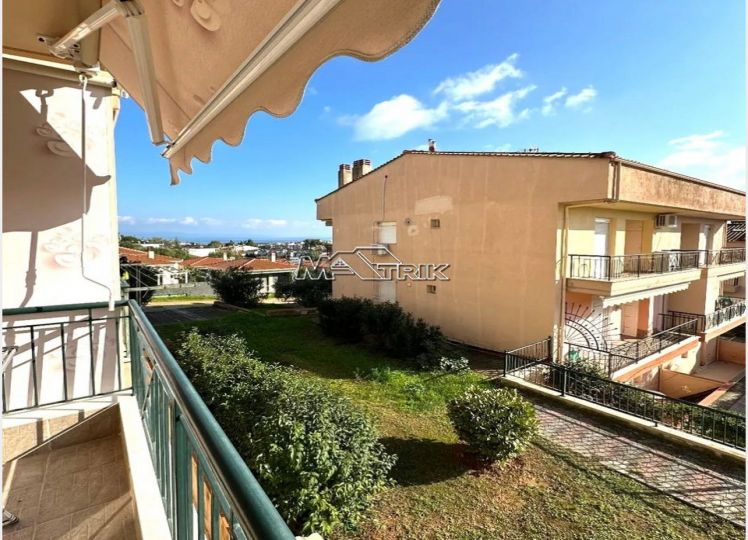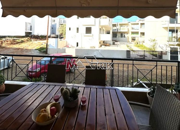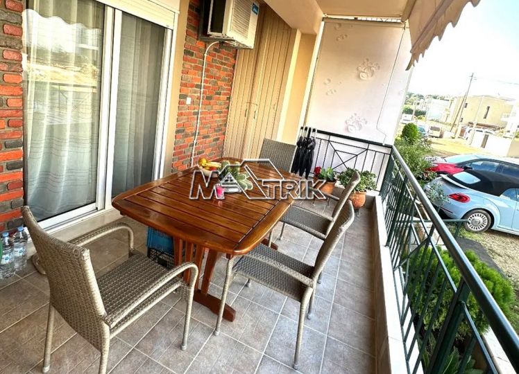 Chalkidiki, Nea Fokaia, 58 sqm first floor apartment in an apartment complex. It consists of two bedrooms, a living room - kitchen and one bathroom. it has aluminum sliding frames with double glazing and nets, tiled floor, armorized door, one a/c, individual oil heating system, solar water heater, comfortable balconies in the front and rear which have awnings, one parking space for exclusive use, as it is fully furnished and equipped with all electrical appliances. It is extremely bright, is located in a quiet location within the village and its distance from the sea is 600m.