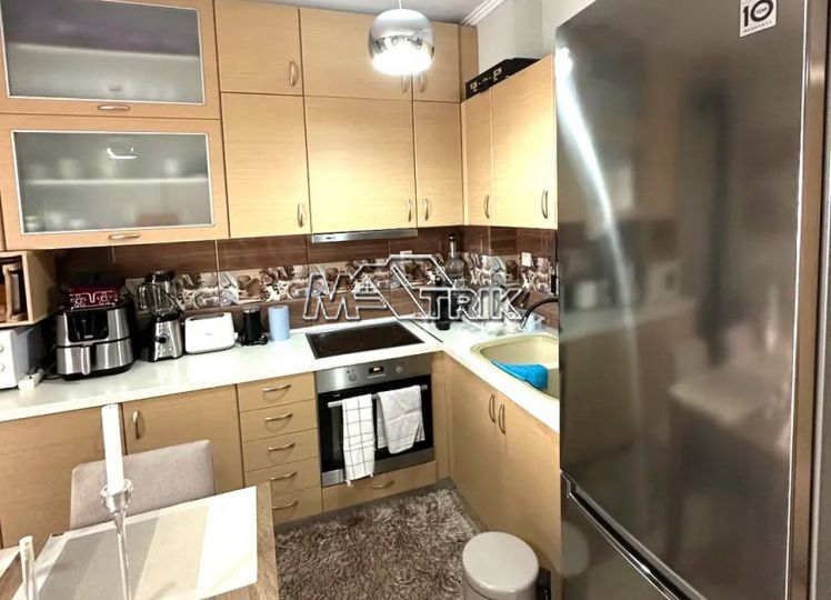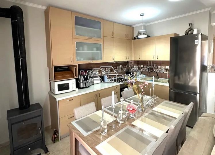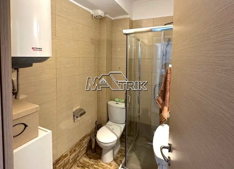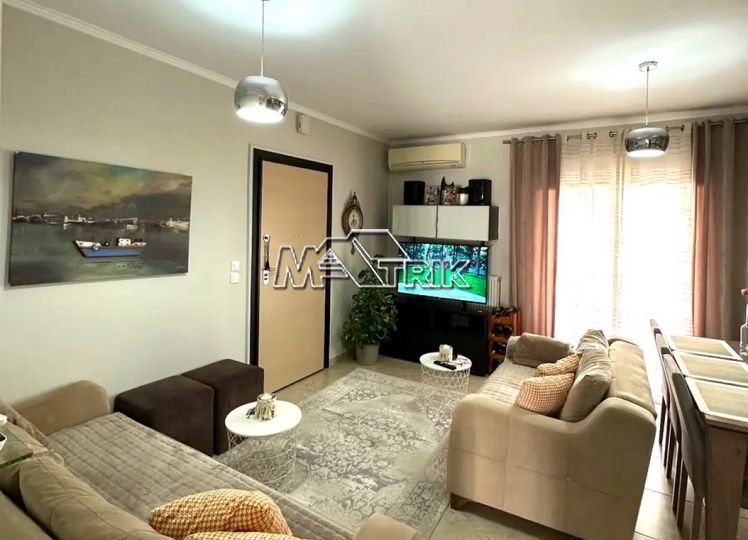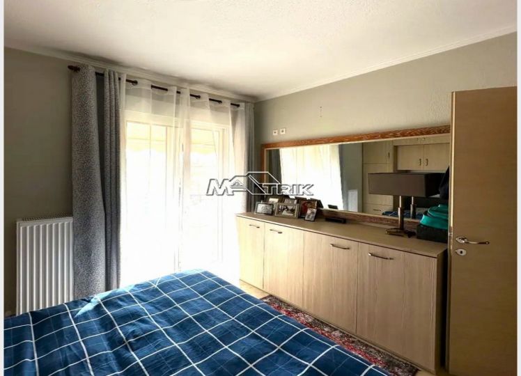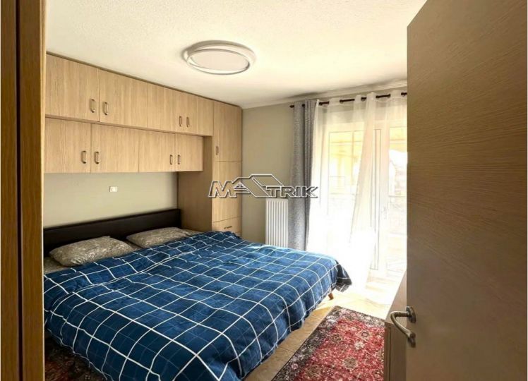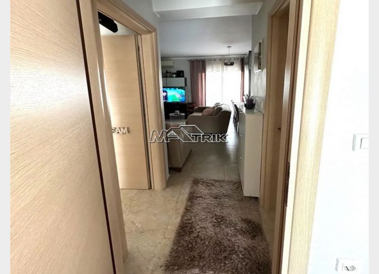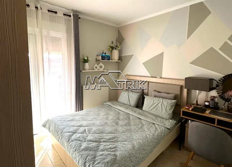 Chalkidiki, Nea Fokaia, 58 sqm first floor apartment in an apartment complex. It consists of two bedrooms, a living room - kitchen and one bathroom. it has aluminum sliding frames with double glazing and nets, tiled floor, armorized door, one a/c, individual oil heating system, solar water heater, comfortable balconies in the front and rear which have awnings, one parking space for exclusive use, as it is fully furnished and equipped with all electrical appliances. It is extremely bright, is located in a quiet location within the village and its distance from the sea is 600m.