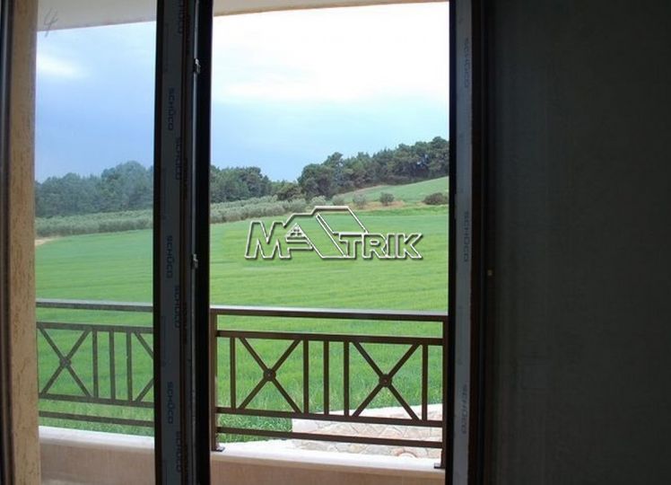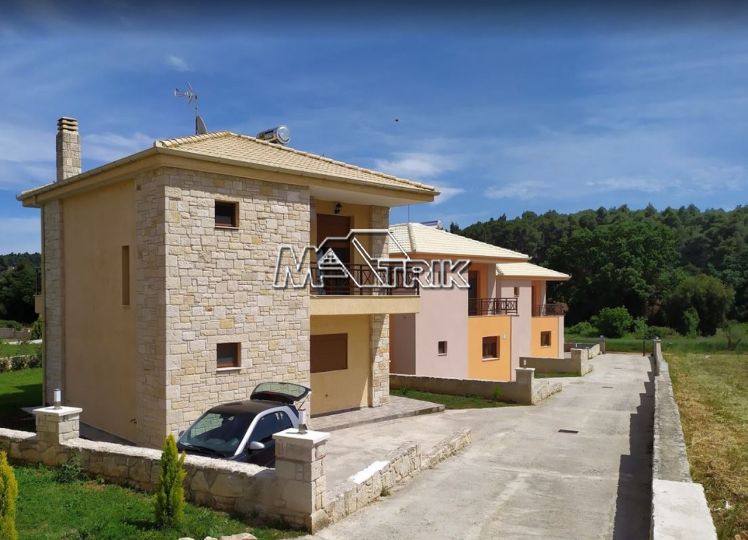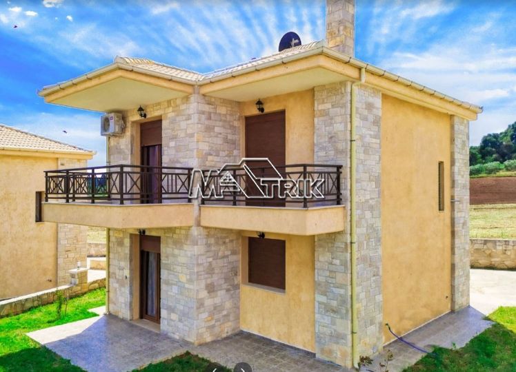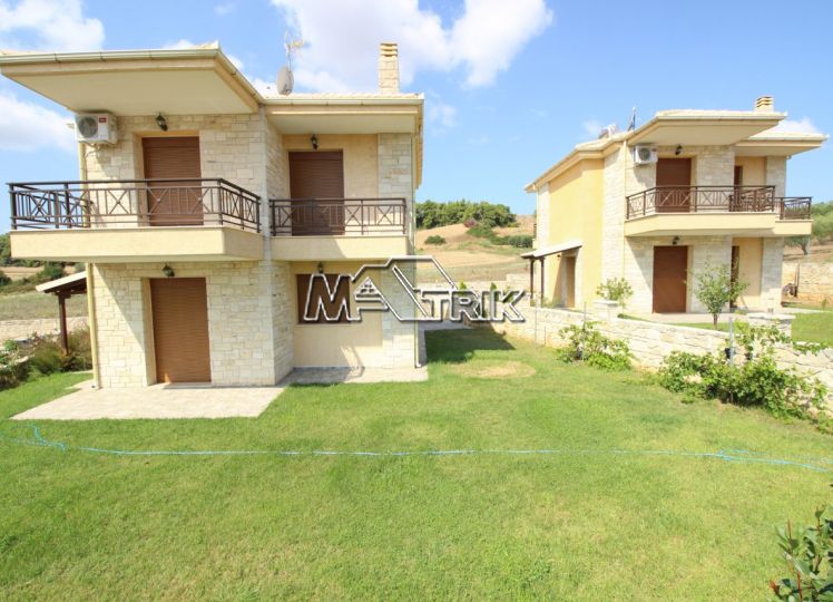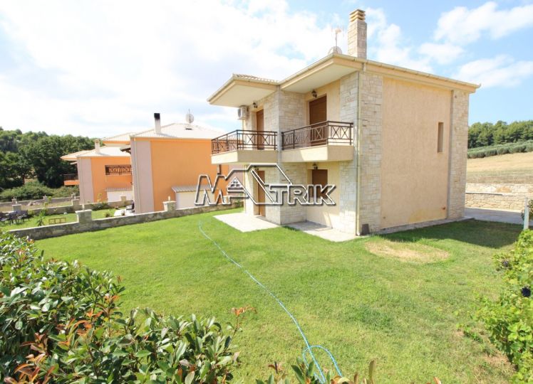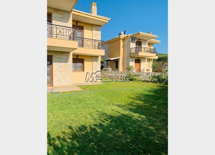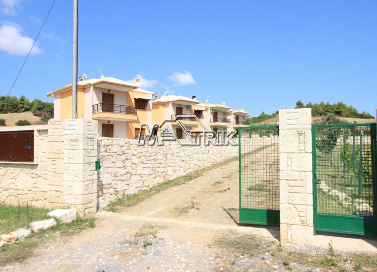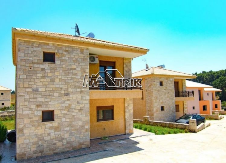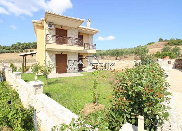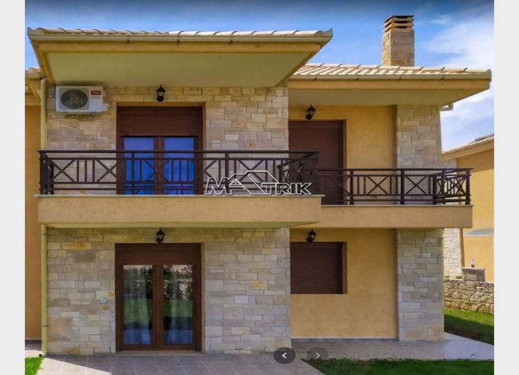 Halkidiki, Nea Fokaia. Detached houses (114m²)ground and first floor, 1000m from the sea and 500m from the village, 300 to 600m² landscaped garden of exclusive use, a storage room and parking spots. The houses are elegantly decorated with Athytos stone wall cladding and consist of a spacious kitchen/living room area with a fireplace, 3 bedrooms and 2 bathrooms. --Ground floor, with access to the garden, consists of the single plan kitchen/living room with the fireplace and one bathroom. --Upper level, with access to a wide veranda, consists of 3 bedrooms and the second bathroom. The houses have an installation of atomic oil heating, aluminum frames (new type) with fly screens, tile flooring, security entrance door, parking spots of exclusive use, storage rooms, bathrooms with bathtub and shower, installation of A/C and alarm plus wardrobes in the bedrooms.