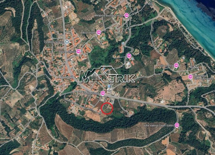 Kryopigi, 2 plots total 4287 sqm, (2045+2242)buildable with possibility of building at least 2520 sqm (plus attic and basement). Inclined with sea view, 300 meters from the local market and 1000 meters from the beach. Facing on 3 roads 19, 27 and 76 meters. There is possibility to buy one of them with price 750.000 euro.