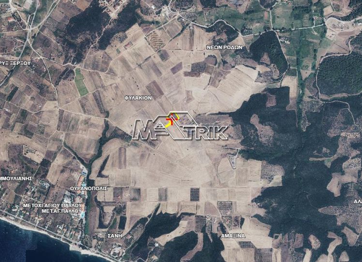 Chalkidiki, Nea Roda, 4300 sqm plot, even and building. It is outside the zone and plan, has a frontage of approximately 110m on a rural road, has an unobstructed sea view, has electricity and water, as well as 390 olive trees. It is building approximately 120 sqm house plus attics and basement and its distance from the sea is 1 km.