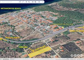 Metamorfosi, field of 1794 sq.m., buildable, with a facade of approximately 21m on two roads (one of them is the main Nikiti - Neo Moudania road). It is 800m from the village and 1200m from the sea.